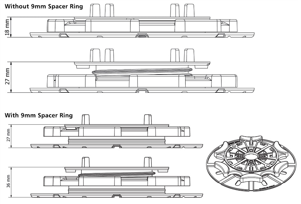 The maximum height of the pedestals can be increased by inserting additional 9mm extender rings into the base, or use in conjunction with the Multi-Level 3560 version above.